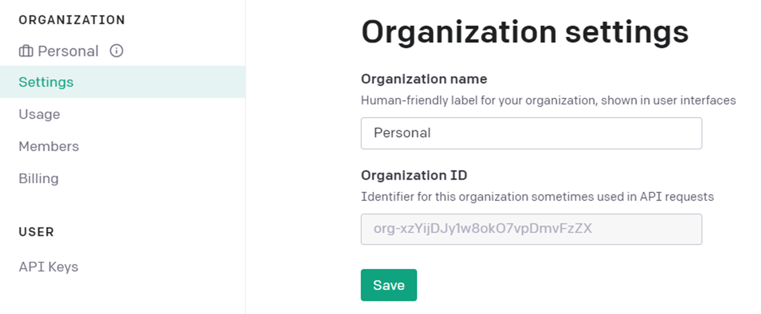 - organization 키는 API키를 발급받은 페이지의 좌측 ORGANIZATION - Settings로 들어가면 확인할 수 있습니다.
