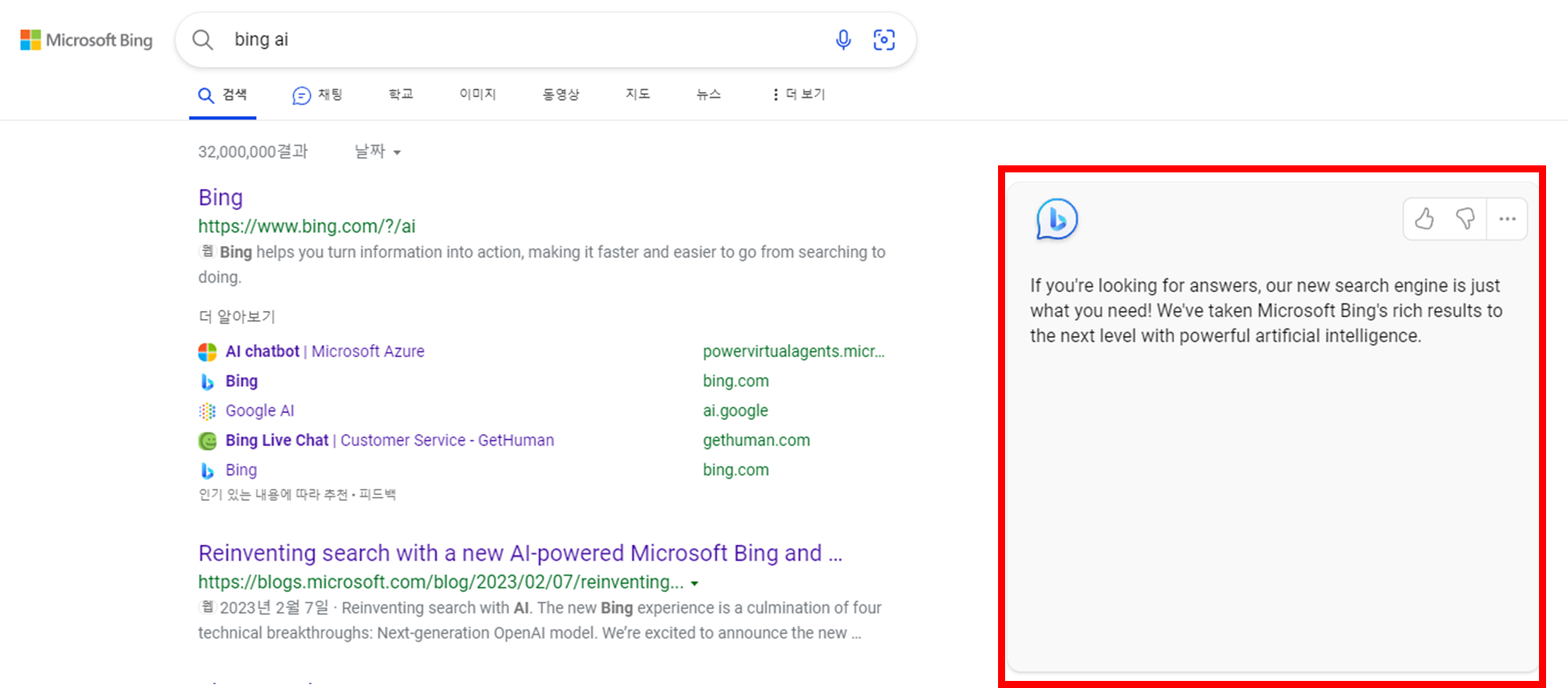 오른쪽에 BingAI의 답변이 보이는데요. 하단의 채팅하기를 눌러보겠습니다.