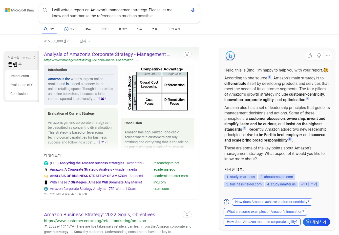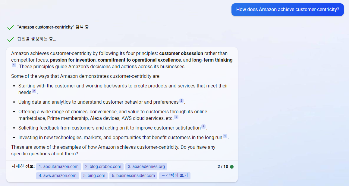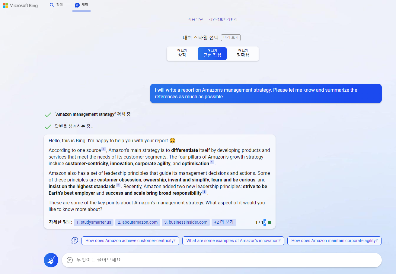 BingAI가 아마존의 경영전략에 대한 다양한 래퍼런스를 찾아주었습니다.