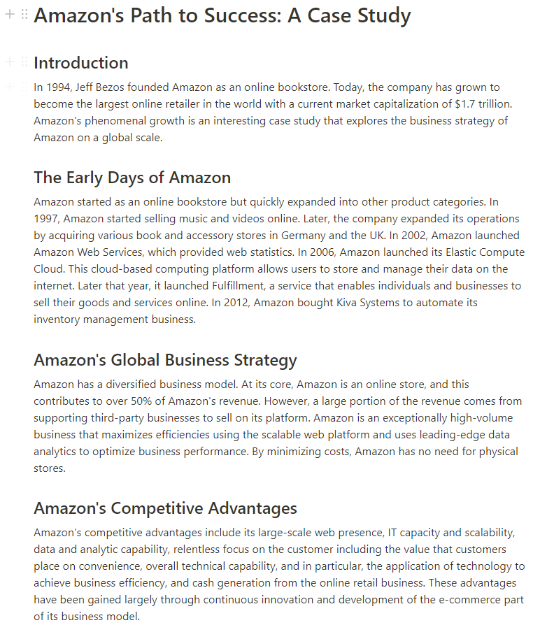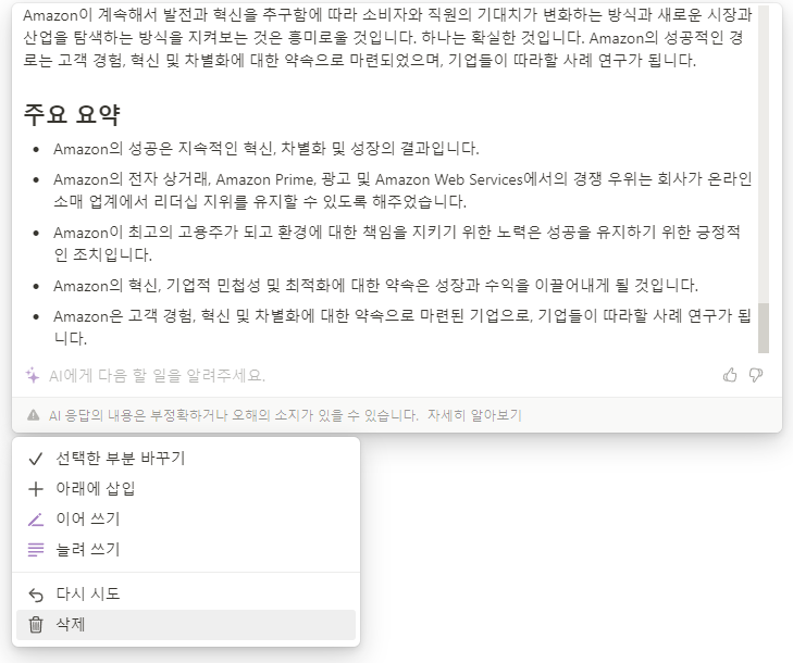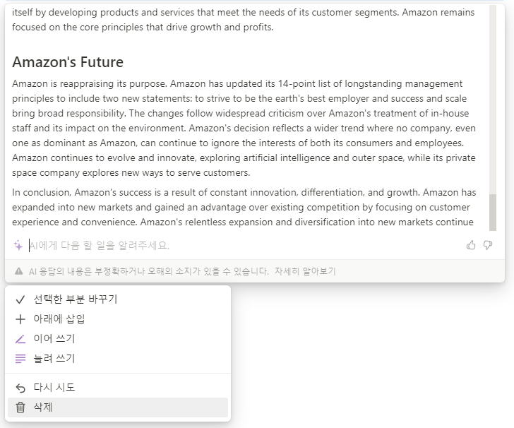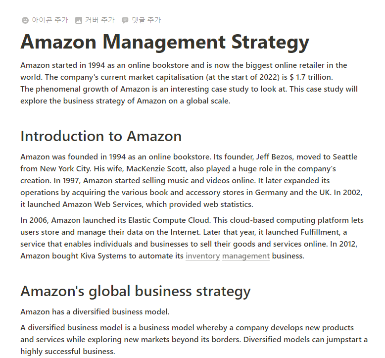 인트로부터 글로벌 경영 전략 및 아마존의 경쟁력 등등.. 다양한 주제로 NotionAI가 에세이를 작성해 주었습니다.